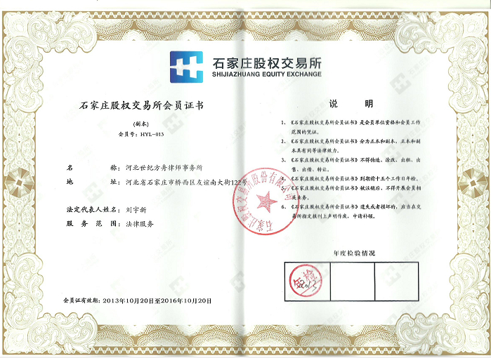 河北世纪方舟律师事务所经石家庄股权交易所批准获得专业服务会员资格